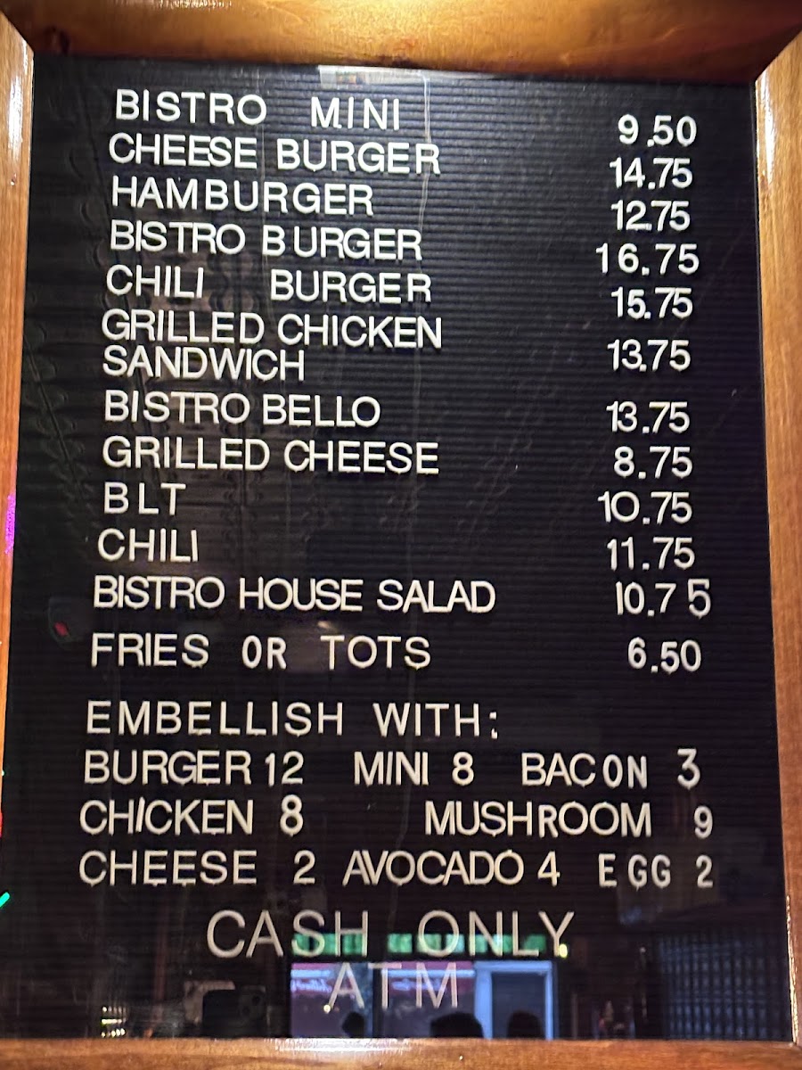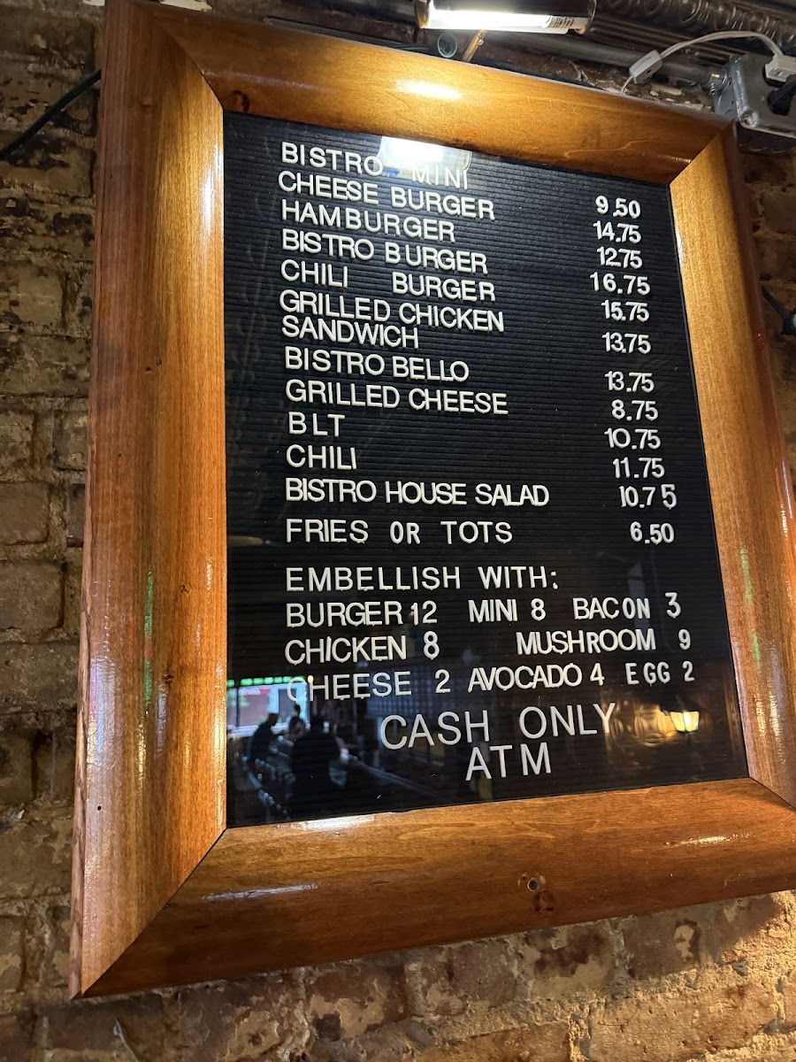 “ THIS IS A CASH ONLY PLACE It's aReal pub atmosphere. Its not super huge. But it has that the old world charm. The menu isn't big but that has an advantage. The food comes out super fast. The burgers and huge and hot and melt in your mouth. I recommend the bistro burger . Also the tots. You will get a large portion of food and can share with at least 2 or 3 people. Sorry no pictures I ate the burger so fast it was gone before I remembered. I would recommend coming here if u want a burger and chill vibe. ”
